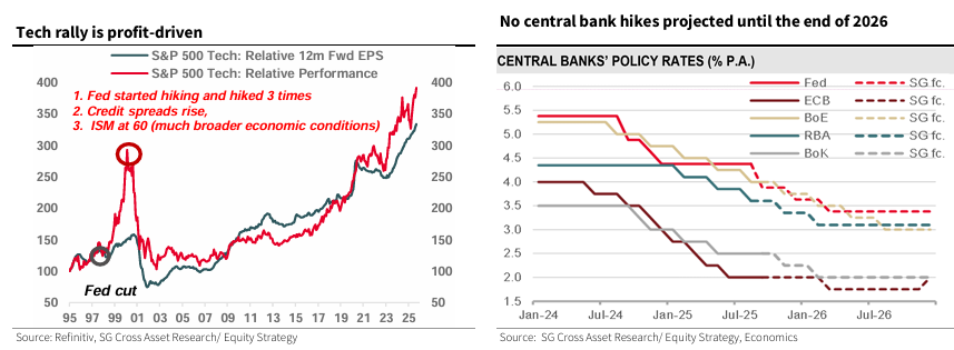 2026년 말까지 중앙은행 금리 인상 없음: SG 예측에 따르면 Fed, ECB, BoE 등 주요 중앙은행의 정책 금리가 2026년 말까지 인상 없이 유지되거나 하락할 것으로 전망됨.