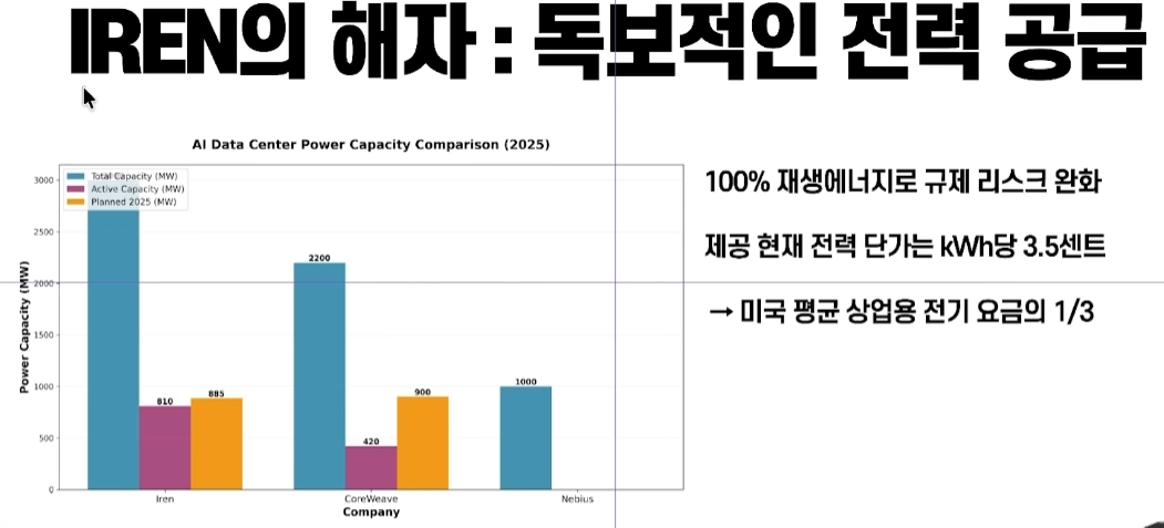 IREN 같은 회사는 매우 많은데, IREN이 가진 강점은 무엇이냐. 독보적인 전력공급임.