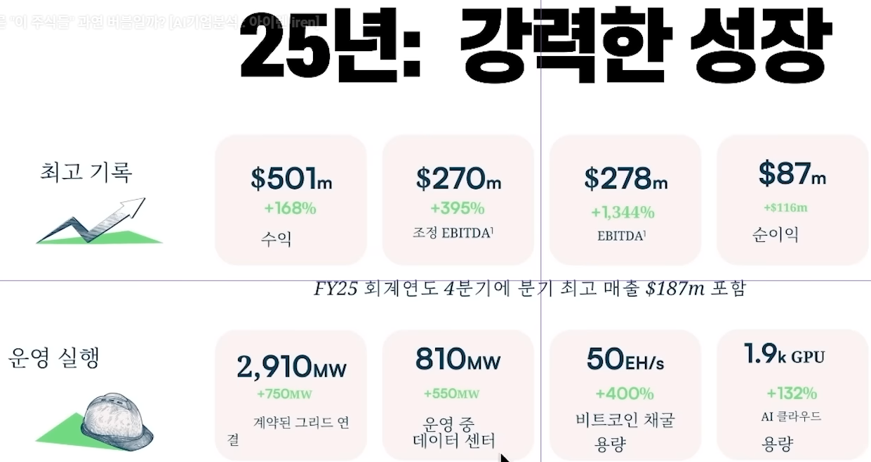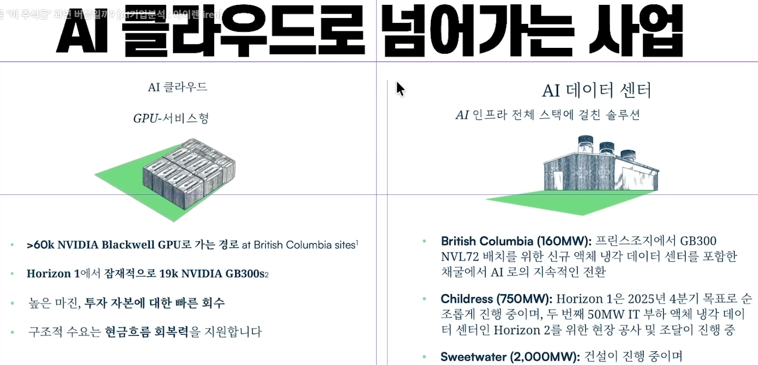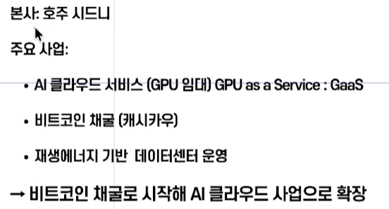 원래는 재생에너지로 비트코인을 채굴하던 업체였지만, 채굴하던 인프라(엔비디아의 GPU)를 임대해주는 클라우드 사업으로 탈바꿈 하고 있음.