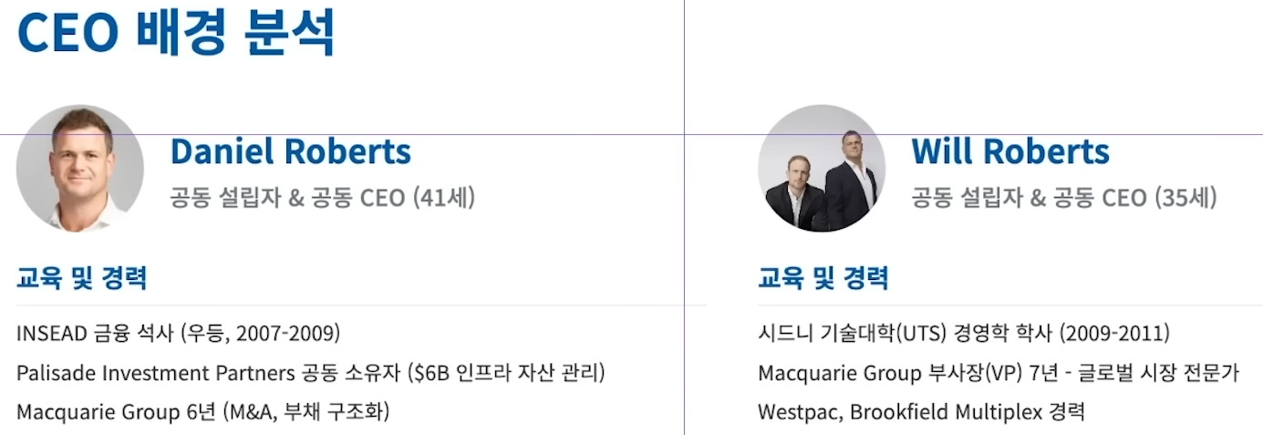 CEO는 맥쿼리 출신의 두 형제임. 다니엘과 윌 이라는 형제가 인프라를 구축해 비트코인을 채굴하다가 22년도의 비트코인 시즌 종료를 맞이하면서 사업 방향을 데이터센터로 전환시킴.