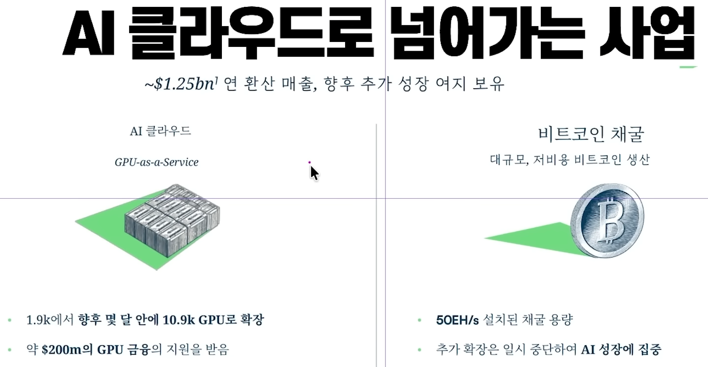 현재 매출은 1.25B인데 직접적인 매출은 비트코인 채굴이 1B이고, AI 클라우드에서 나오는 매출은 0.25B 정도임.