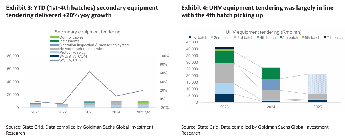 긍정적인 점은 4차 UHV 장비 입찰 규모가 약 150억 위안으로 발표된 것임. 이는 1~3차 입찰 총액(63억 위안) 대비 크게 증가한 규모이며, 새로 승인된 2개의 VSC-DC 노선에 주로 사용될 예정임. VSC-DC 노선은 컨버터 밸브의 비중이 높기 때문에 Nari Tech(역사적으로 컨버터 밸브 시장 점유율 약 50%)와 같은 상위 컨버터 밸브 공급업체에 혜택이 될 것으로 보이며, 매출 인식은 2026년에 반영될 것으로 예상됨.