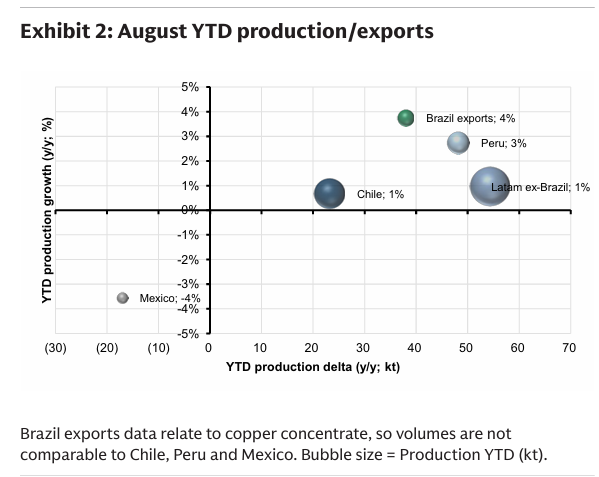 연초 대비(YTD) 기준으로 이 지역의 구리 생산량 증가율은 브라질 제외 시 +1% y/y로 완만한 수준임. 이 증가율은 GS 상품팀의 보합(flattish) 전망을 상회하는 수준이며, 주로 칠레의 강력한 생산량 덕분임. 페루는 전망치에 부합하고, 멕시코는 주요 부진 지역(main laggard)으로 약세를 보였음. 브라질의 8월 구리 수출은 전년 대비 4% 증가함.