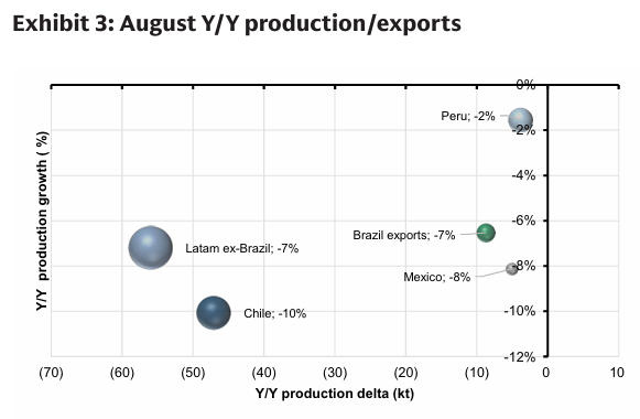 8월 전년 대비 생산/수출 변화를 국가별로 보여줌. 8월 전년 대비 생산 증가율은 페루(-2%), 브라질 수출(-7%), 멕시코(-8%), 칠레(-10%) 순으로 나타나 모든 국가에서 감소세를 보였음.