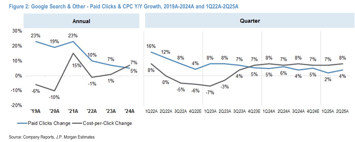 Figure 2: Google Search & Other - Paid Clicks & CPC Y/Y Growth, 2019A-2024A and 1Q22A-2Q25A (Google 검색 및 기타 부문의 유료 클릭 및 CPC의 전년 동기 대비 성장률) (내용 순서대로 이 위치에 그래프가 들어갈 것으로 안내함)