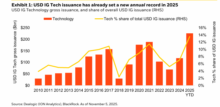 2025년은 USD IG 기술 부문의 총 발행액이 이미 새로운 연간 기록을 세웠음.