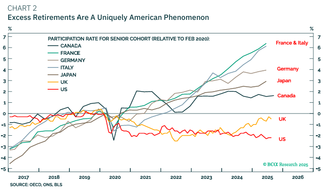 현재 세계 경제에서 가장 중요하지만 주목받지 못하는 구조적 변화는 팬데믹 이후 미국 고령 근로자의 붕괴임. 이는 '초과 은퇴(excess retirements)'로 불리며, 유독 미국에서만 나타나는 현상임.