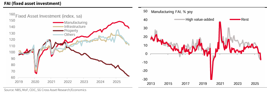 고정자산투자(FAI) 급락이 충격적이었으며, 이는 과잉 생산 능력 우려와 여전히 취약한 재정 부양책 때문임.