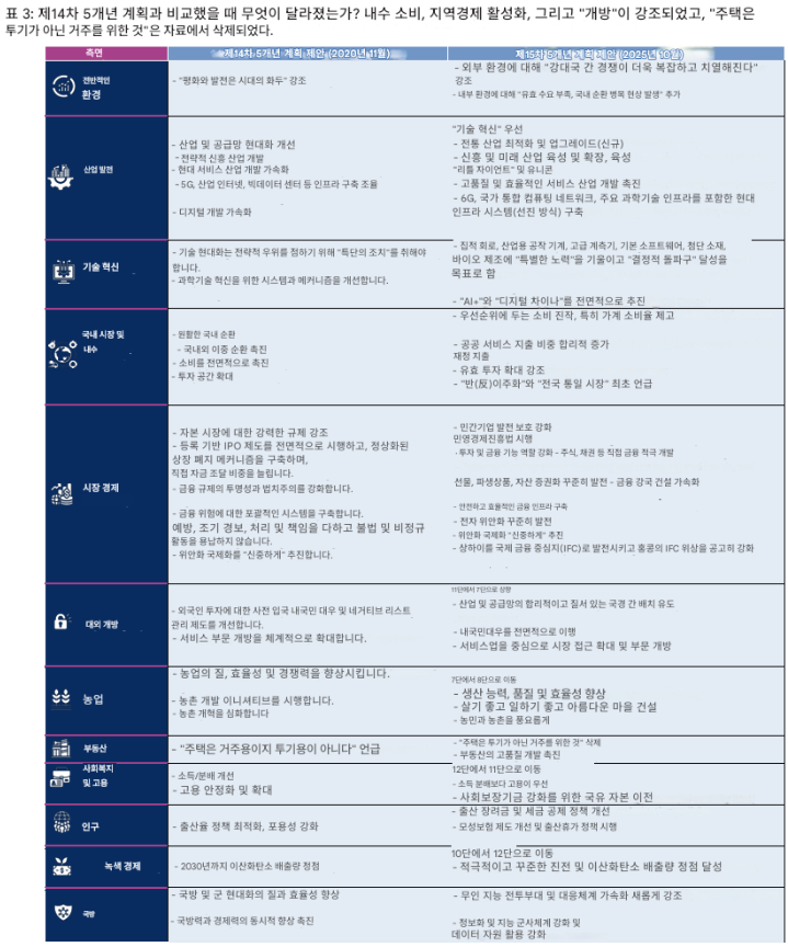 내수 소비: 5개년 계획 역사상 처음으로 '국내 소비 지원'이 최우선 순위(섹션 순서 5위)로 격상됨.