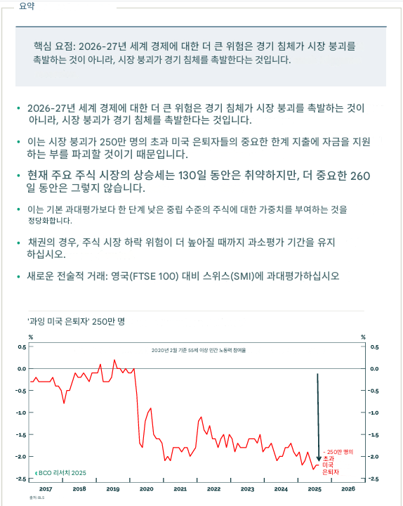 반등 요인: 4월 저점 이후 관세 위협 완화, 지속적인 경제 성장, 달러 약세, 추가적인 재정 지원 등에 힘입어 주가가 다시 사상 최고치를 경신했음.