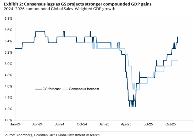 Exhibit 2: 골드만삭스(GS)는 강력한 복합 GDP 성장을 전망하는 반면 컨센서스는 이에 뒤처짐