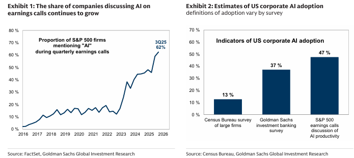 AI 관련 언급 증가: 이번 분기 현재까지 실적을 발표한 S&P 500 기업의 49%가 컨퍼런스 콜에서 AI 관련 효율성 증가 잠재력을 언급했음.