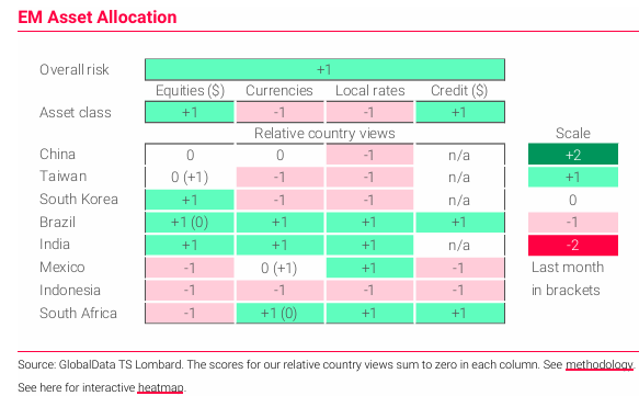 글로벌 성장 역학은 EM 아시아가 주도하는 EM에 유리함: 중국 및 EM ex-China의 성장 전망 개선 속에서 주식 자산군 선호도를 유지하며, 적당한 달러 강세는 EM 통화 및 현지 채권 시장에 부담을 줄 수 있음.