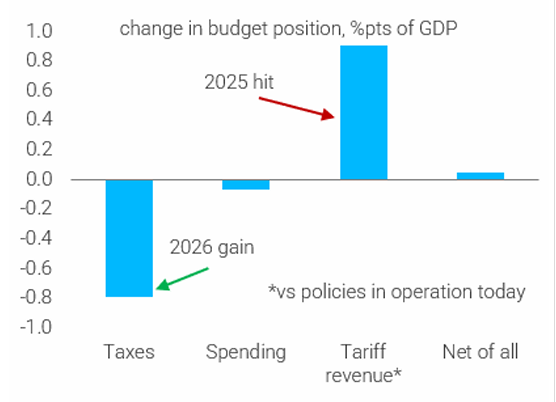 순 효과(Net net)는 변화가 없는 것으로 보이지만, 관세는 2025년에 발생했고 세금 감면은 2026년에 시행됨. 이로 인해 재정 충격은 GDP의 -1%에서 +1%로, 즉 2%p만큼 급격히 변동될 것으로 예측됨.