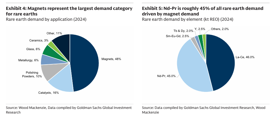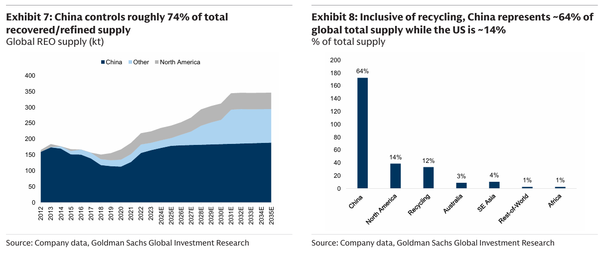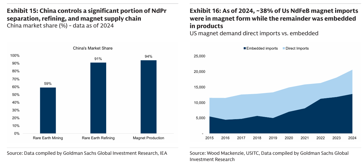 중국은 희토류 채굴에서 59% , 희토류 정제에서 91% , 자석 생산에서 94% 의 시장 점유율을 차지하며 공급망의 상당 부분을 통제하고 있음.