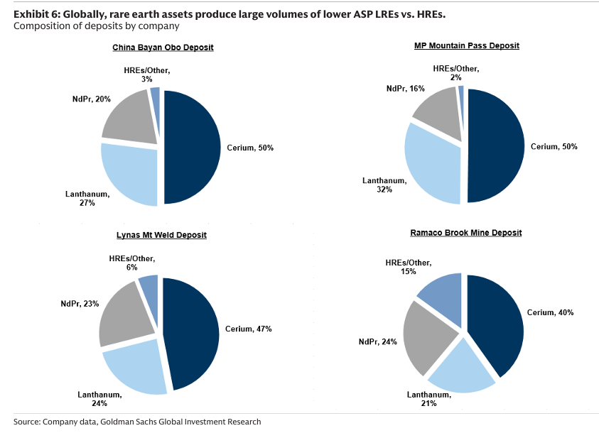 마운틴 패스 광상은 NdFeB 자석 생산에 중요한 NdPr이 15.7%를 차지하며, 나머지는 세륨과 란타넘이 약 85%를 차지함.