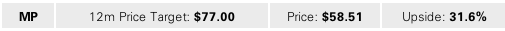 MP Materials (MP)에 대한 커버리지를 매수(Buy)로 개시하며 12개월 목표주가를 $77.00로 설정했음. 이는 현재 가격 $58.51 대비 약 31.6%의 상승 여력(Upside)을 의미함.
