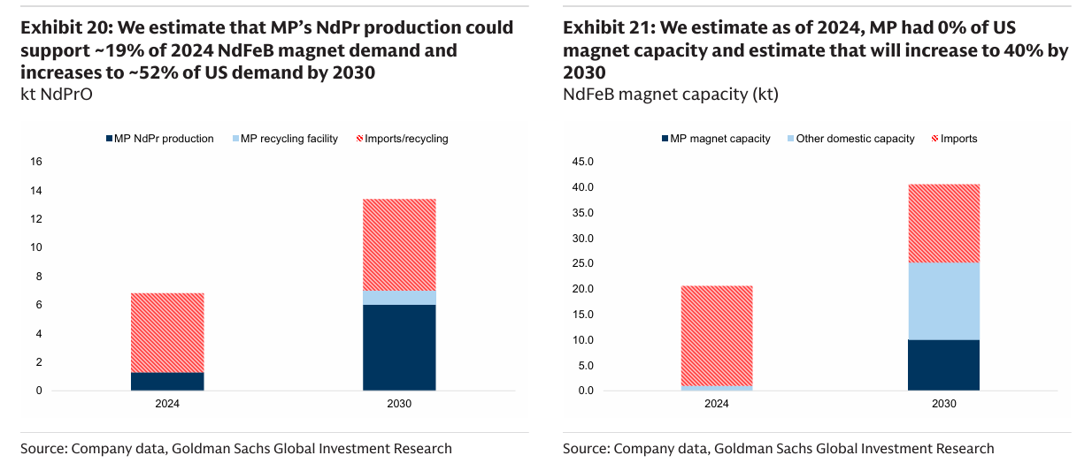MP의 NdFeB 자석 생산 능력은 2024년 국내 수요의 0%에서 2030년까지 약 25%로 증가할 것으로 예상됨.