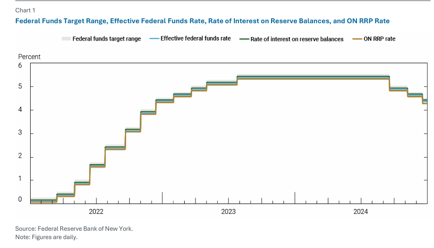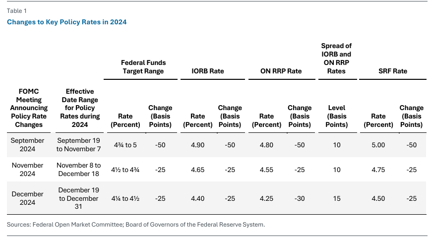 2024년 동안 FOMC는 연방기금 금리 목표 범위를 5 ¼~5 ½퍼센트에서 4 ¼~4 ½퍼센트로 1%p 인하했음.
