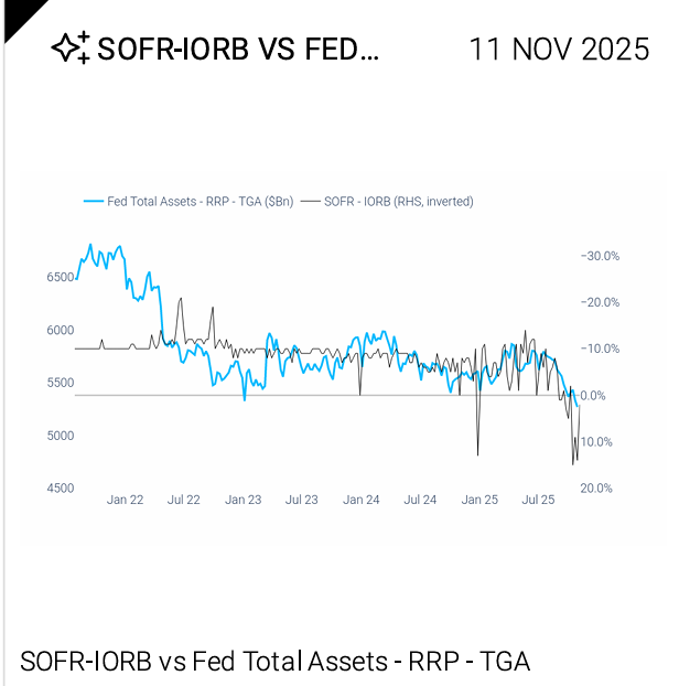 관리 금리 대비 시장 금리 상승: 국채 수익률 및 광범위한 레포 금리(SOFR)와 같은 민간 자금 시장 금리가 연준의 관리 금리(IORB, ON RRP 금리) 대비 상대적으로 높아지는 추세를 보였음.