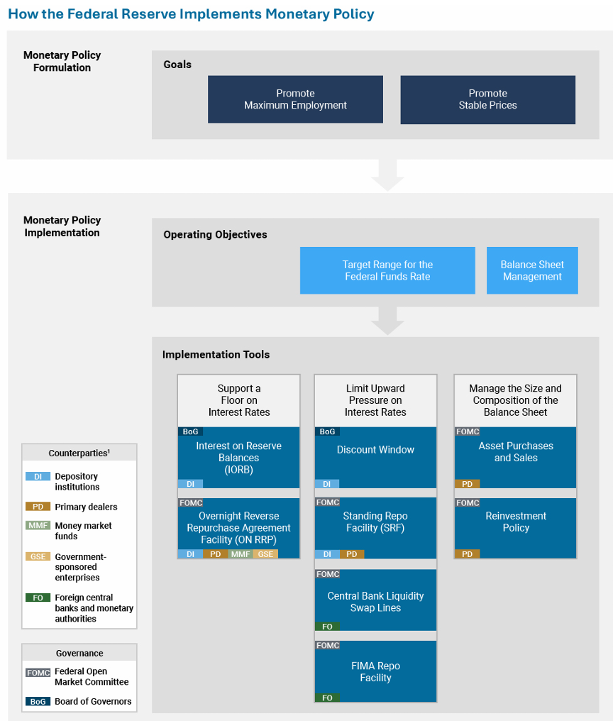 이 체계는 연준이 설정하는 관리 금리(administered rates)와 FOMC의 정책 금리 목표 범위에 부합하는 자금 시장 환경을 조성하기 위해 Desk가 수행하는 시장 운영(market operations)을 포함함.
