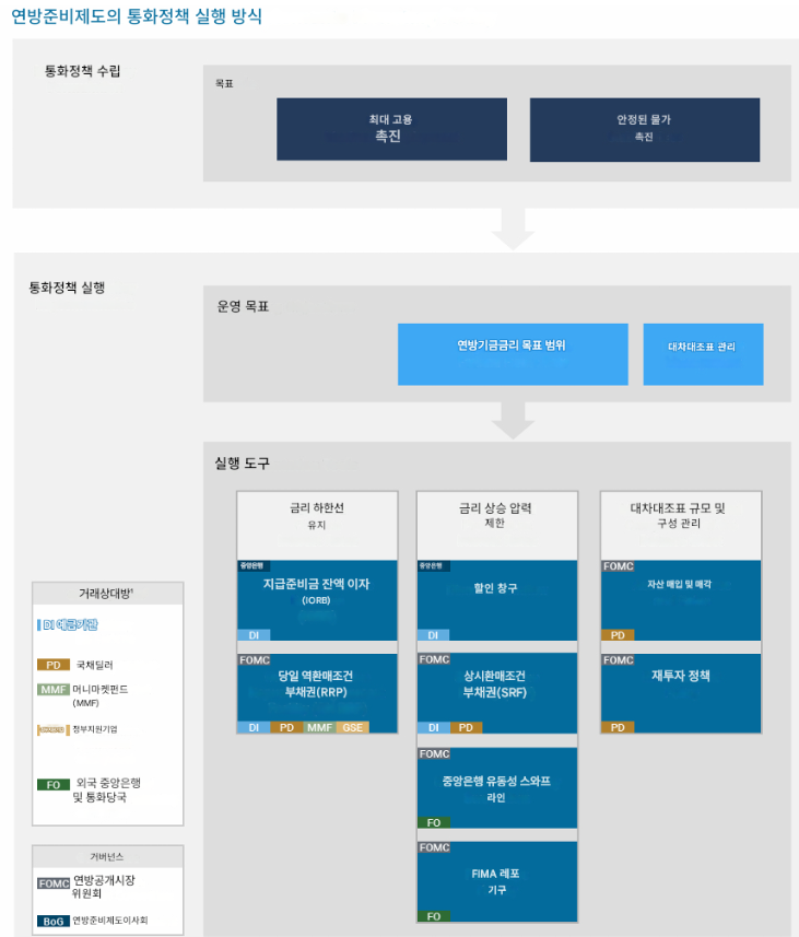 연방준비제도는 연방기금 금리에 대한 목표 범위를 설정하여 FOMC의 정책 스탠스를 전달하는 체계 내에서 통화 정책을 이행함.