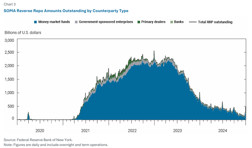 (차트 3은 2021년 이후 총 RRP 잔액이 급증했다가 2023년부터 2024년까지 급격히 감소하며, 대부분이 MMF에 의해 사용되었음을 보여주는 그래프임.)