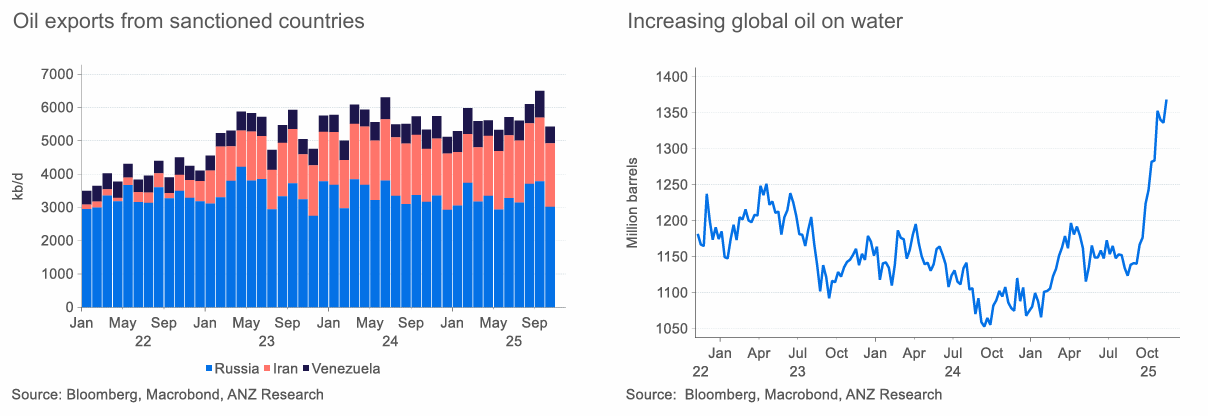 러시아, 이란, 베네수엘라의 원유 흐름을 억제하기 위한 제재 압력 강화로 해상에 적재된 원유 물량(소비에 즉시 이용 불가능하고 운송 중인 원유)이 증가하고 있음.