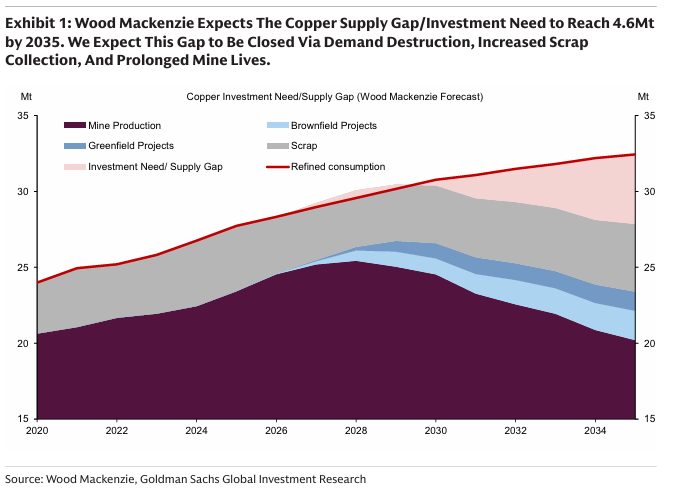 Wood Mackenzie는 2035년까지 구리 공급 격차/투자 필요성이 4.6Mt에 달할 것으로 예상했으나, GS는 이 격차가 수요 파괴, 스크랩 수거 증가, 광산 수명 연장을 통해 해소될 것으로 예상함.