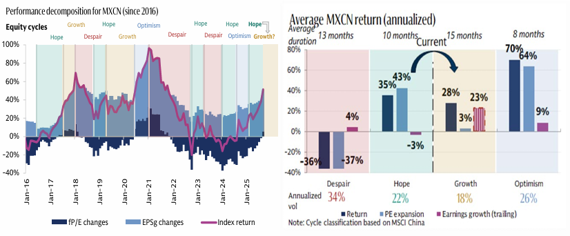 The Equity Cycle is turning, from Hope to Growth, where profit growth typically drives equity returns : MSCI China를 기반으로 분류된 사이클(Despair, Hope, Growth, Optimism)의 연평균 수익률 및 구성 요소(PE 확장, 이익 성장)를 비교함. Despair 단계에서는 수익률이 -36%로 이익 성장과 PE 확장 모두 마이너스였음. Hope 단계(평균 10개월)에서는 연평균 43%의 수익률을 보였으며, PE 확장이 주도했음(35%). Growth 단계(평균 15개월)에서는 연평균 28%의 수익률 중 이익 성장이 23%로 주된 동인임 . 현재 시점은 Hope 단계에서 Growth 단계로의 전환기에 있는 것으로 보임.