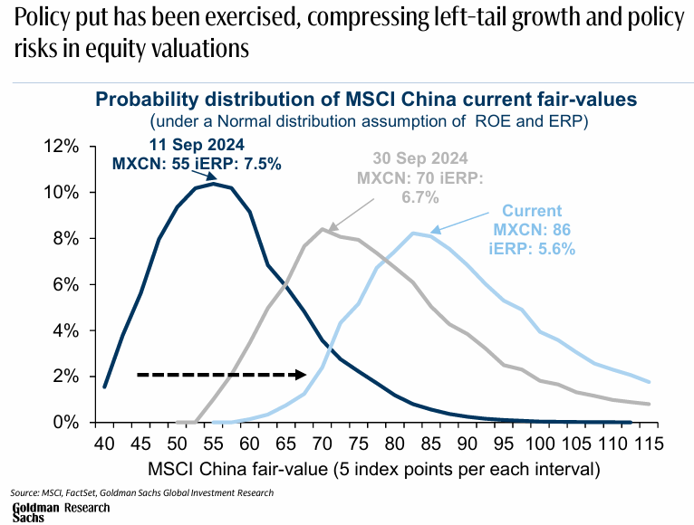 MSCI China의 현재 공정가치(fair-value) 확률 분포를 보여줌. 2024년 9월 11일(MXCN 55, iERP 7.5%) 대비 2025년 '현재'(MXCN 86, iERP 5.6%)로 이동하면서 확률 분포가 오른쪽으로 이동했으며, 이는 잠재적인 하방 위험(left-tail)이 감소했음을 의미함 . 내재 주식 위험 프리미엄(iERP)도 하락하여 위험 압축 현상을 뒷받침함.