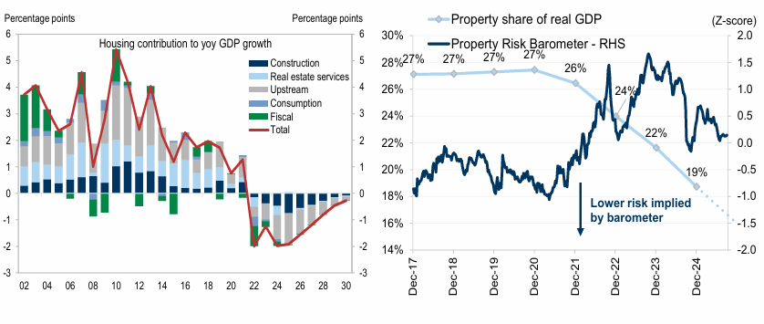 부동산: 구매 제한 완화(City-specific policies), 주택 거래 인지세율 인하, 은행 대출 화이트리스트 프로젝트 확대 등 완화 정책이 지속됨. 2026년 주택의 전년 대비 GDP 성장 기여도는 -1.6%로 2025년과 동일할 것으로 예상됨.