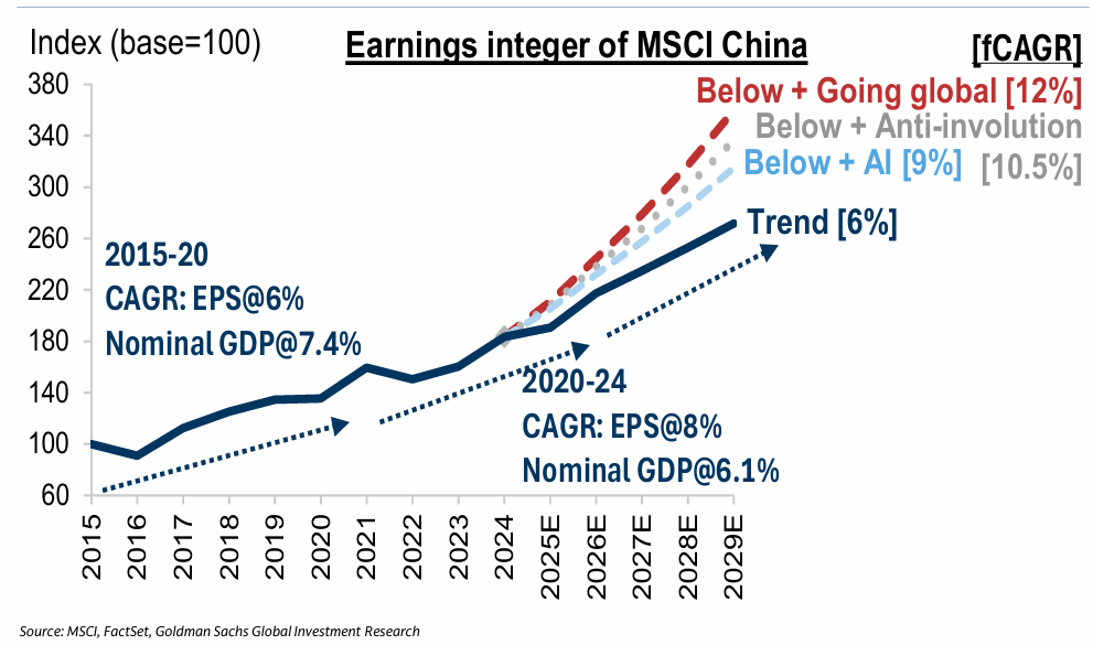 AI, anti-involution, and "Going Global" could lift trend EPS growth to low-teen levels : AI, Anti-involution, 'Going Global' 추세가 추세적인 주당순이익(EPS) 성장을 낮은 두 자릿수(low-teen) 수준으로 끌어올릴 수 있음. 'Going Global'과 'Anti-involution', 'AI boost'가 결합되면 추세적인 이익 성장률을 기존 6%에서 12%까지 높일 수 있는 시나리오가 제시됨 .