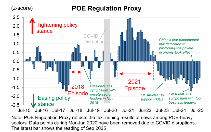 The POE regulation cycle has inflected (POE Regulation Proxy) : 민간 기업(POE) 규제 프록시(z-점수)는 2021년 규제 에피소드 이후 강화 추세를 보였으나, 2022년 중반부터 완화 추세로 전환됨. 2025년 2분기 중국 최초의 민간 경제 촉진을 위한 기본법이 발효되면서 규제 스탠스가 더욱 완화되는 모습을 보였으며, 현재(2025년 9월)의 POE 규제 프록시는 -1.0 수준으로 완화 정책 기조를 시사함 .