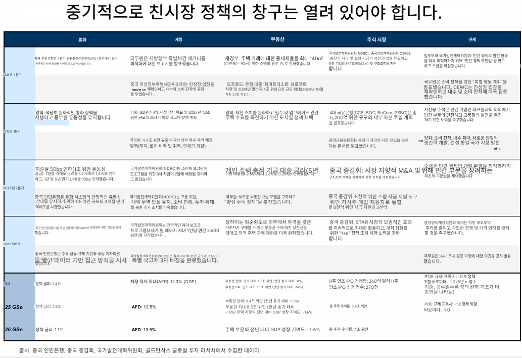 The pro-market policy window should stay open in the medium term (Monetary, Fiscal, Property, Equity Market, Regulation 정책 요약) : 2024년 4분기부터 2026년 전망까지 통화, 재정, 부동산, 주식 시장, 규제 부문의 주요 정책 조치들을 분기별 요약.