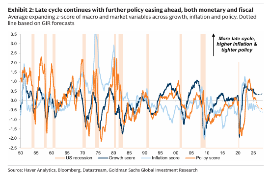 Exhibit 2: 경기 후반은 지속되며 통화 및 재정 완화가 예정되어 있음 (성장, 인플레이션, 정책 매크로 및 시장 변수의 평균 확대 Z-스코어 시계열 그래프)