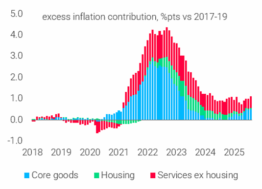관세, 주거비, 임금 압력 완화로 글로벌 근원 인플레이션은 2026년 말까지 2.2%로 하락할 것으로 예상되며, 이는 우호적인 글로벌 성장/인플레이션 조합을 가져올 것임.