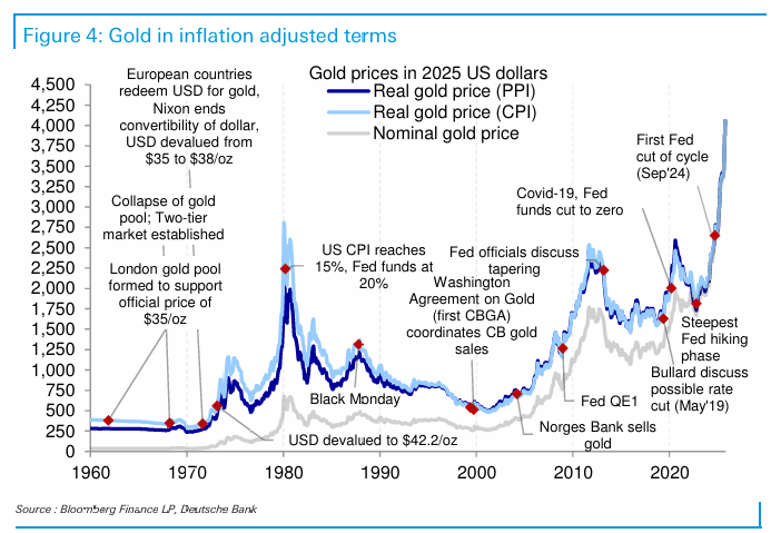 [ Figure 4 인플레이션 조정 금 가격] 1960년부터 현재까지의 명목 금 가격과 실질 금 가격(PPI 및 CPI 기준) 추이. 현재 명목 가격은 역대 최고치이나 실질 가격 기준으로는 1980년 정점에 근접해가고 있음.