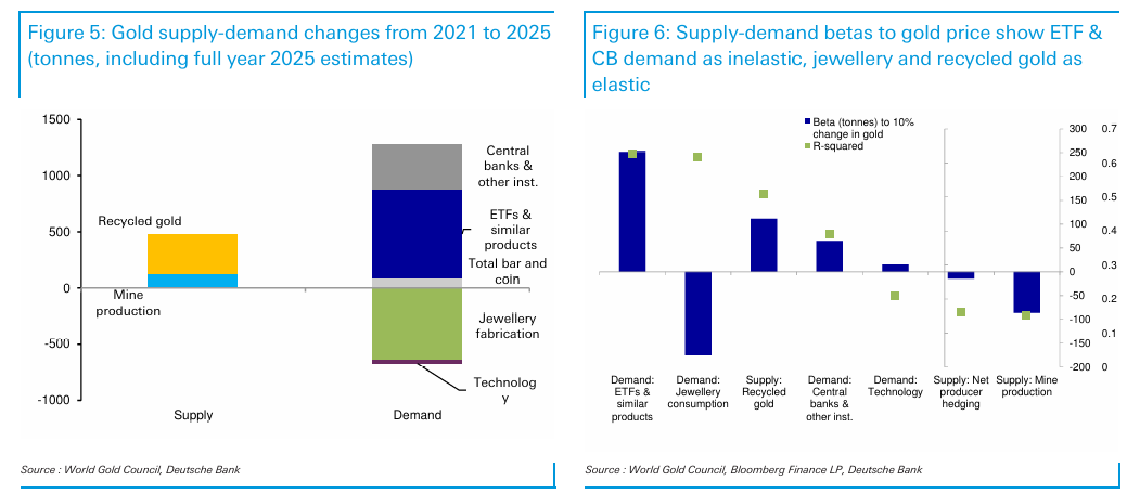 [ Figure 5 2021년부터 2025년까지 금 수급 변화 (톤)] 공급 측면에서는 재활용 금과 광산 생산이 소폭 증가했으나, 수요 측면에서는 중앙은행 및 ETF 수요가 급증하여 보석 수요 감소분을 압도하고 있음.