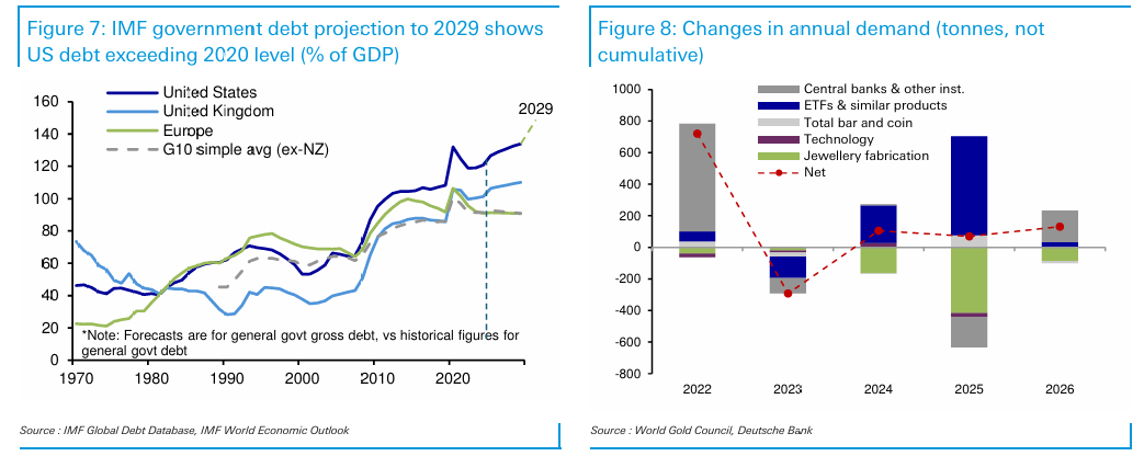 미국 정부 부채 증가와 달러가 포함된 재정 모델상 금 가치 평가에 긍정적인 요소들이 2029년까지 지속될 것으로 IMF 부채 전망이 시사함.