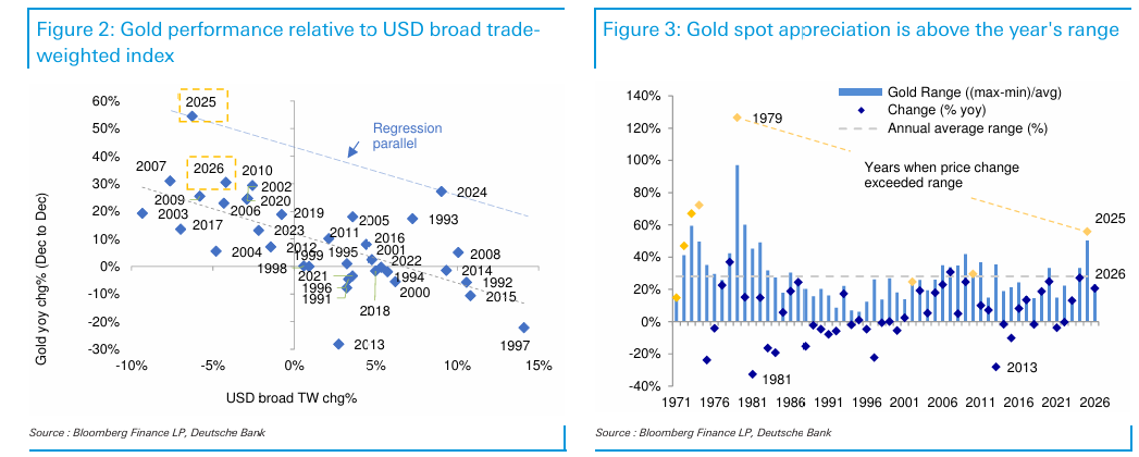 당사의 2026년 전망치를 이 차트들에 대입해 보면, 달러 대비 상대적으로 덜 예외적인 해가 되더라도, 그리고 역사적 변동폭 대비해서도 금은 여전히 최근의 강세를 확장해 나갈 수 있음을 시사함.