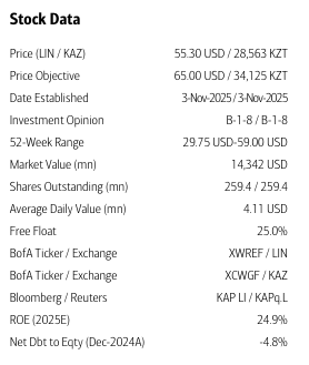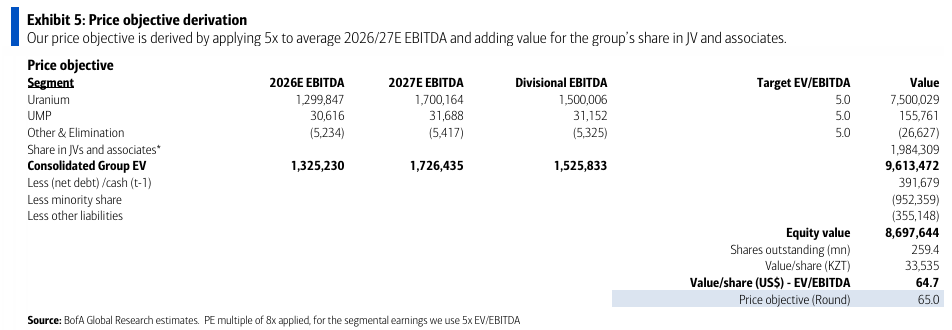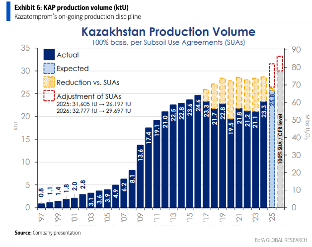 BofA는 2026년 생산량을 28.6kt(그룹 기준 100%)로 모델링했으며, 이는 KATCO 및 Budenovskoye 광산 램프업에 힘입어 전년 대비 15% 증가한 수치임.