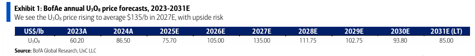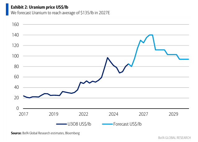 BofA 원자재 분석팀은 우라늄 가격이 2027년에 평균 135달러/lb까지 상승할 것으로 전망함.