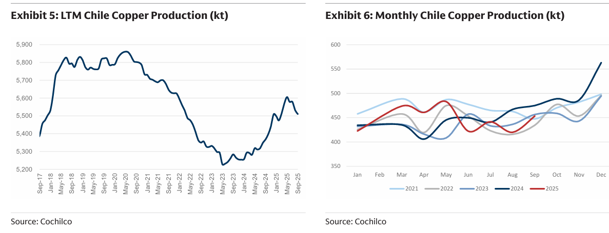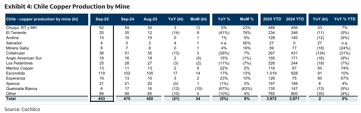 칠레의 9월 구리 생산은 전년 대비 5% 감소했음. 이는 El Teniente(-41%), Collahuasi(-26%), Quebrada Blanca(-67%)의 생산 차질 때문임. 다만 YTD 기준으로는 전년과 비슷한 수준(Flat)을 유지하며 GS의 2025년 전망치(-1%)를 소폭 상회하고 있음.