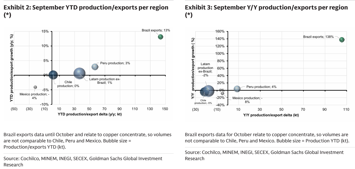 반면 칠레의 Escondida 광산은 호조를 이어갔으며, El Teniente 광산도 사고 이후 부분적인 회복세를 보였으나 여전히 사고 이전 수준보다 30% 낮은 가동률을 기록함. 브라질은 Vale사의 광산들 덕분에 수출이 급증했음.