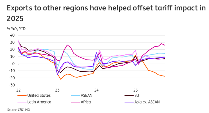 향후 전망: 이러한 회복력이 지속될지는 불확실함. ING의 예측은 내년에 주요 경제국들의 성장률이 약간 둔화될 것을 시사하며, 새로운 촉매제가 없다면 중국 수출 수요 증가율이 둔화될 수 있음. 최근 일본, 네덜란드와의 마찰 재연은 대외 환경이 매우 예측 불가능함을 상기시켜 줌.