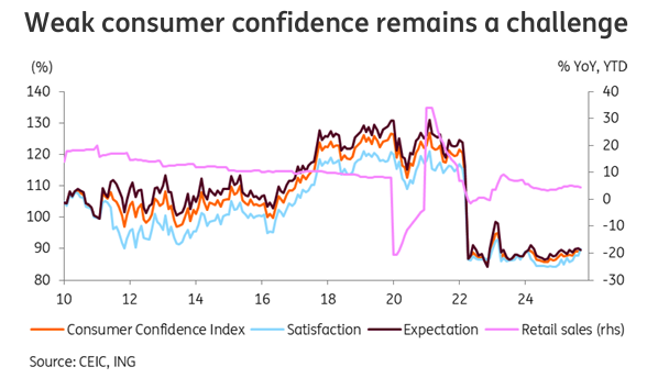 만약 외부 수요 환경이 덜 지원적일 것이라는 ING의 전망이 현실화된다면, 중국의 성장 전망은 국내 수요인 내부 순환이 그 부족분을 만회하도록 요구할 것임. 이 능력은 중국이 국내 수요를 지원하기 위해 어떤 정책 이니셔티브를 사용하는지에 달려 있음