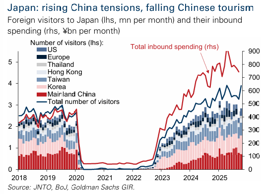 고조되는 일본-중국 긴장은 중국 관광객 감소와 대중국 일본 수출 감소로 인해 일본 GDP 성장에 0.2%p의 타격을 줄 것으로 추정.