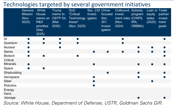 공식적으로 가장 전략적으로 중요한 부문에 대한 정의는 없지만, 트럼프 행정부는 AI, 양자 컴퓨팅, 원자력 기술, 생명 공학과 희토류/핵심 광물, 반도체 같은 관련 투입물을 우선시하는 것으로 보임. 로봇 공학 및 드론, 조선, 항공우주, 전력 기술 또한 우선순위에 있지만, 그만큼 중심적인 초점은 아님.