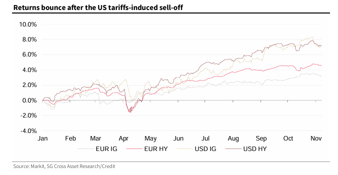 특히 3월 말 미국 관세 발표 이후 관찰된 급격한 변동성을 고려할 때, 이러한 지표들의 성과는 주목할 만함. 수익률 하락 후 회복은 현재 신용 시장을 실제로 탈선시킬 수 있는 유일한 장애물은 경기 침체 위험이라는 것을 보여줬음.